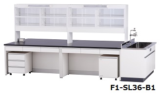 引き出しのついた中央実験台にステンレス流し・試薬棚・ワゴンを組み合わせ、より機能性を向上させました。| シリーズ | F1-SL24-B1 | F1-SL30-B1 | F1-SL36-B1 | F1-SL42-B1 |