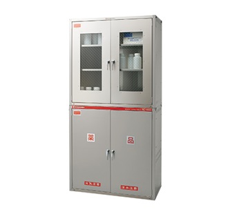 | 仕様 | 【器具格納庫】網入りガラス付両開き戸棚(施錠可能) 棚板(高さ可変)2枚つき | 【薬品庫】劇毒物室(下段内) W788× D370×H350mm(専用施錠つき) 棚板(高さ可変)1枚つき 劇物・毒物表示マークつき |