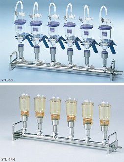 | 材質 | フィルターホルダー:硬質ガラス クランプ:アルミ合金 マニホールド:SUS304 三方コック:PTFE、FPM、真鍮 通気用フィルターホルダー:SUS304 洗浄液送液チューブ:シリコーン 洗浄液用二方コック:ガラス ゴムキャップ:シリコーン | フィルターホルダー:ポリサルホン サポートスクリーン:ポリプロピレン ファンネルO-リング:シリコーン マニホールド:SUS304 三方コック:PTFE、FPM、真鍮 通気用フィルター:ポリプロピレン/PTFE 洗浄液送液チューブ:シリコーン 洗浄液用二方コック:PC/ポリプロピレン |
