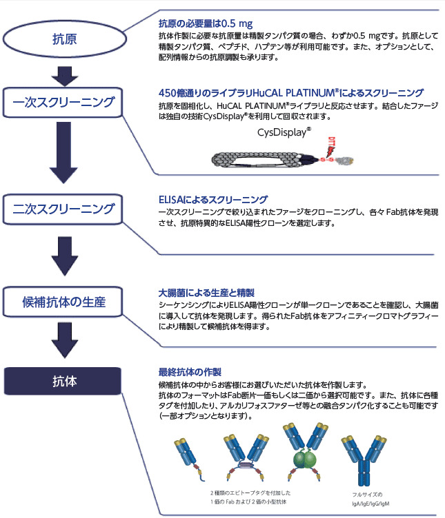 ®(Human Conbinatorial Antibody Library)はヒト抗体の多様性を網羅する独自の組換えFab抗体のライブラリーであり、さまざまな種類の抗原に対して特異性の高い人工抗体を作製するために開発された最高品質のライブラリーです。