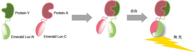 E-Lucは、従来より用いられているホタルルシフェラーゼと比べ安定で、強いシグナルを出すことが知られています。このルシフェラーゼを2つのパーツに分解(スプリット)し、それぞれを細胞内に導入すると、自然界にはない2つのルシフェラーゼのタンパク質断片が生成されます。細胞内でこれらの2つのフラグメントが会合することによって高感度の発光シグナルが発生いたします(特許取得済み)。