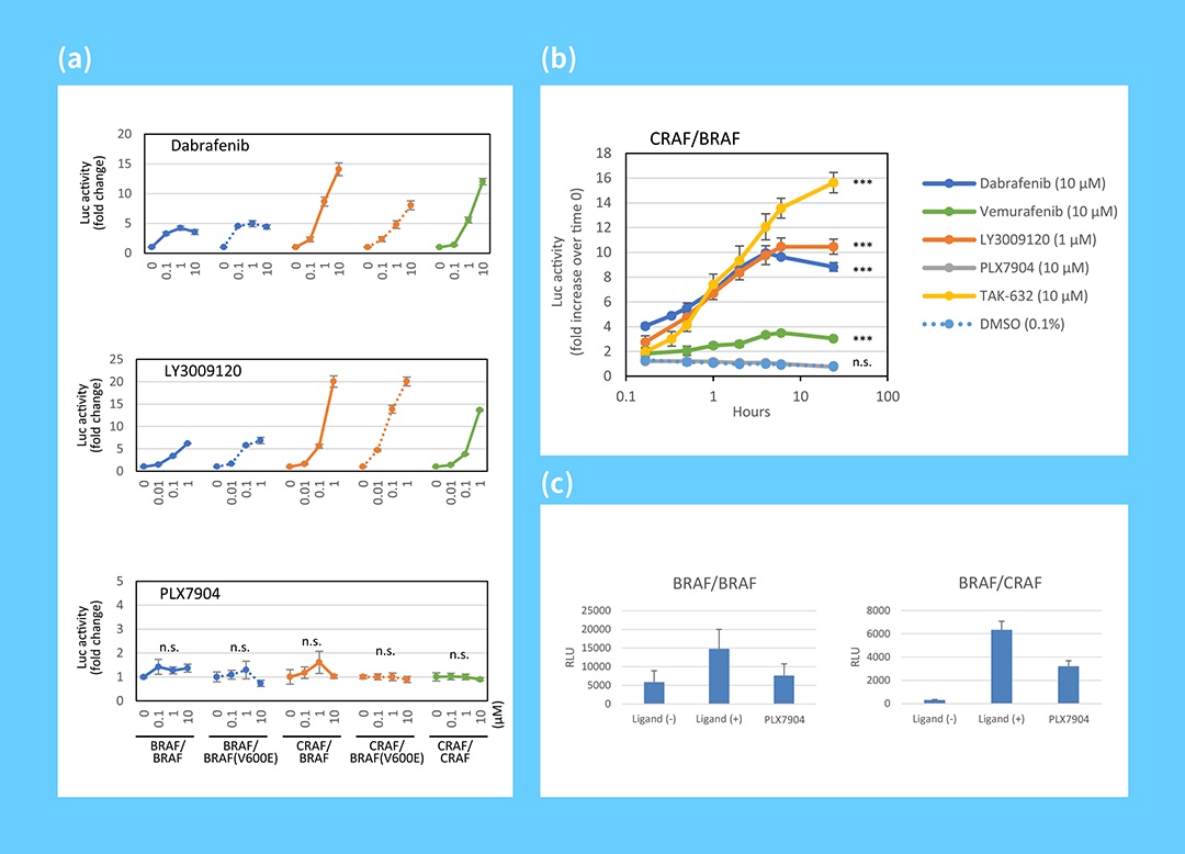 BRAF/BRAF, BRAF/BRAF[V600E], CRAF/BRAF, CRAF/BRAF[V600E], CRAF/CRAF 5種類の組み合わせアッセイでご要望に合わせてカスタマイズされたRAF 二量体化に対する化合物評価試験を受託致します。これらのアッセイでは、RAFの二量体化を誘導する化合物の誘導評価が可能です。また、リガンドによって二量体化を誘導し、その作用を化合物が阻害するかどうかを定量的に測定することも出来ます。