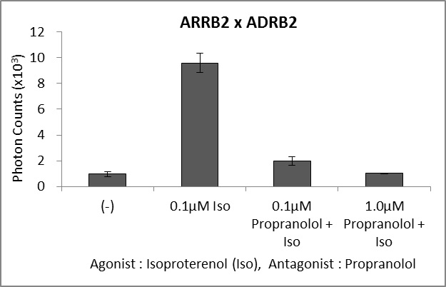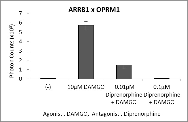 fig.5)に示しますように、GPCRにEmerald-LucのC-末部分を、β-アレスチンに同N-末部分を結合させた遺伝子を細胞内で同時に発現させ、リガンドのGPCRへの結合をスプリットルシフェラーゼで検出するアッセイ系を構築しております