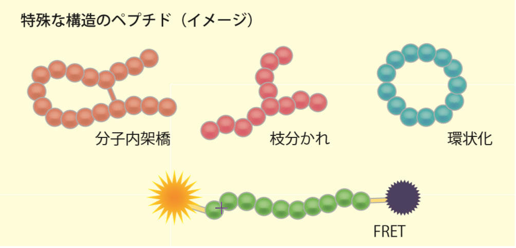 ハイドロキシプロリン【Hyp】 ピログルタミン酸【Pyr】 フェニルグリシン【Phg】 プロパギルグリシン【Pra】 ペニシラミン【Pen】 ホモシステイン【Hcy】 α-メチルアラニン【Aib】 リン酸化(Tyr, Ser, Thr) 各種D体アミノ酸 各種N-メチルアミノ酸 各種PEG |