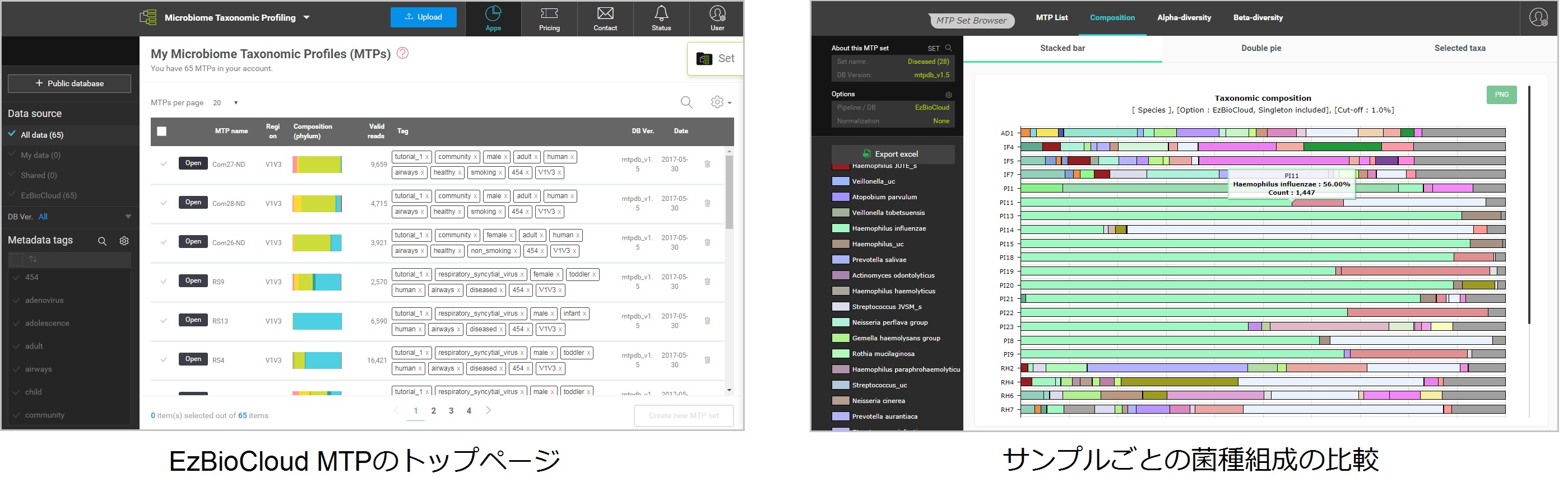 EzBioCloud 16S rRNA gene-based Microbiome Taxonomic Profiling(MTP)(*1, 2)を利用して、下記の内容を閲覧・分析していただけます。