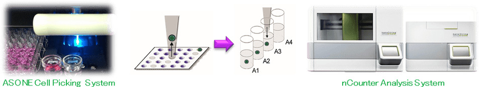 本サービスでは、「AS ONE Cell Picking System」を用いて、大規模な細胞群から全自動で目的細胞を1細胞ベースで検出し、迅速に回収する技術を提供致します。生細胞を1細胞単位で様々な容器に回収できるため、回収後に培養したり、NGS/RNAseqなどの遺伝子解析を行うことも可能です。