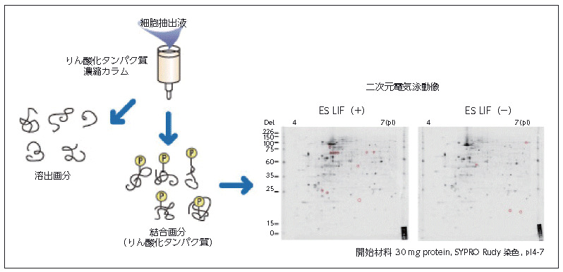 そこで、LIFを添加することでES細胞内のりん酸化タンパク質がどの様に変動するか、りん酸化タンパク質に親和性のあるカラムと二次元電気泳動・質量分析計を用いて、網羅的に解析しました。(