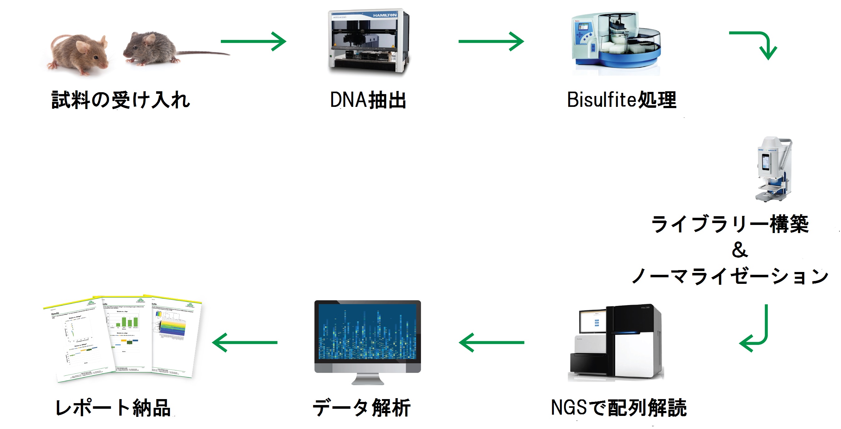 お送りいただいたヒトまたはマウスの試料からDNAメチル化のレベルを測定し、エピジェネティクス的年齢を決定する受託サービスです。