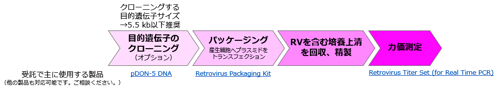 一過性ウイルス産生システムRetrovirus Packaging Kitを販売しています。
