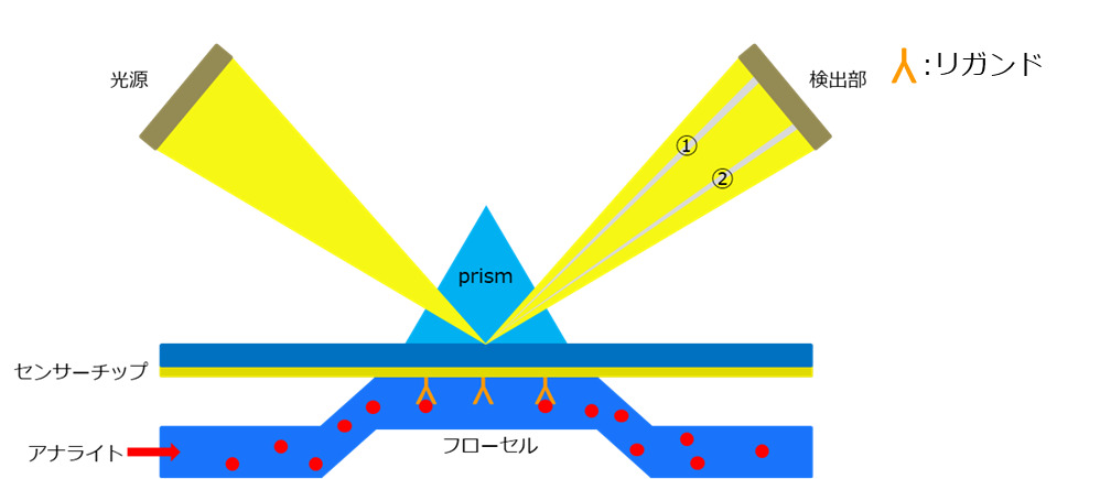 相互作用をみたい物質のうち一方(リガンド)をセンサーチップの金薄膜上に固定し、センサーチップの裏側から金薄膜とガラスの境界面で全反射するように光を当てると、反射光の一部に反射強度が低下した部分(SPRシグナル)ができます。相互作用をみたい物質の他方(アナライト)をセンサーチップの表面に流しリガンドとアナライトが結合すると、固定化されているリガンド分子の質量が増加し、センサーチップ表面の溶媒の屈折率が変化します。この屈折率の変化によってSPRシグナルも変化します。(