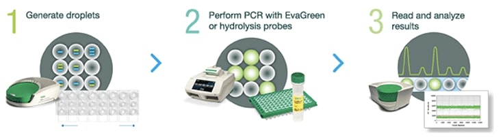 Bio-Rad QX200デジタルPCRシステムは加水分解プローブと二本鎖DNAにインターカレートするEvaGreen色素のどちらでも測定することができます。