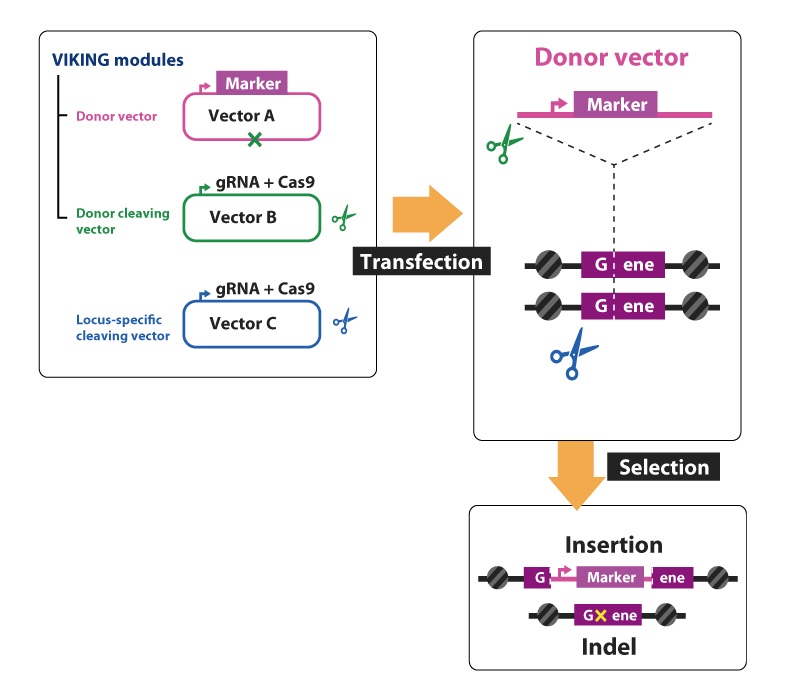 VIKING法により、ゲノム上の標的遺伝子のコーディング領域に、薬剤耐性遺伝子などのマーカーを含むドナーべクターを挿入した培養細胞を作製します。多くの場合、もう片方の対立遺伝子では、数塩基のランダムな塩基の欠損や挿入(indels)が導入されます。これにより、フレームシフト変異による遺伝子の機能欠損(ノックアウト)が期待できます。
