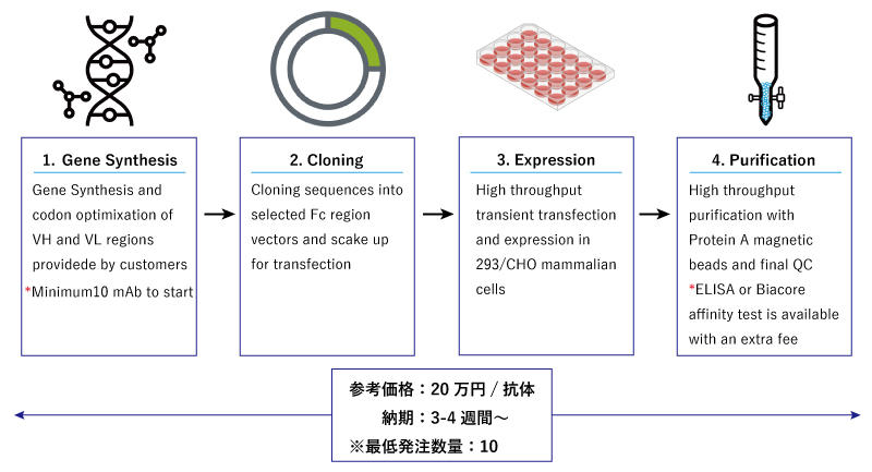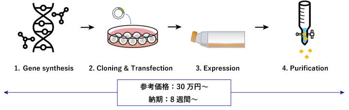 遺伝子合成および発現ベクターの構築から発現精製までをワンストップで実施します。価格と納期はいずれも一例となります。