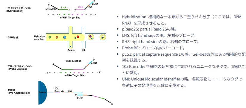 | 解析メカニズム | 全トランスクリプトームパネルのそれぞれの標的遺伝子に対するプローブを使用して発現遺伝子を検出する |