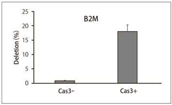 Cas3 ‒ Cascade-crRNA複合体を導入した試験区では平均して18.1%の細胞にB2M遺伝子が発現していないことを確認した。(n=3)