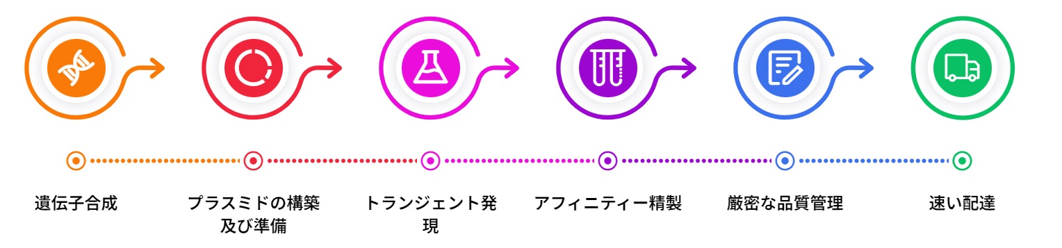 哺乳動物細胞システム技術による発現は、通常、ご希望の配列の合成から始まります。プラスミドベクターの構築後、CHOK1(Chinese hamster ovary)細胞またはHEK293(human embryonic kidney)細胞への組換えベクターのトランスフェクションを行い、タンパク質の発現と精製を行います。