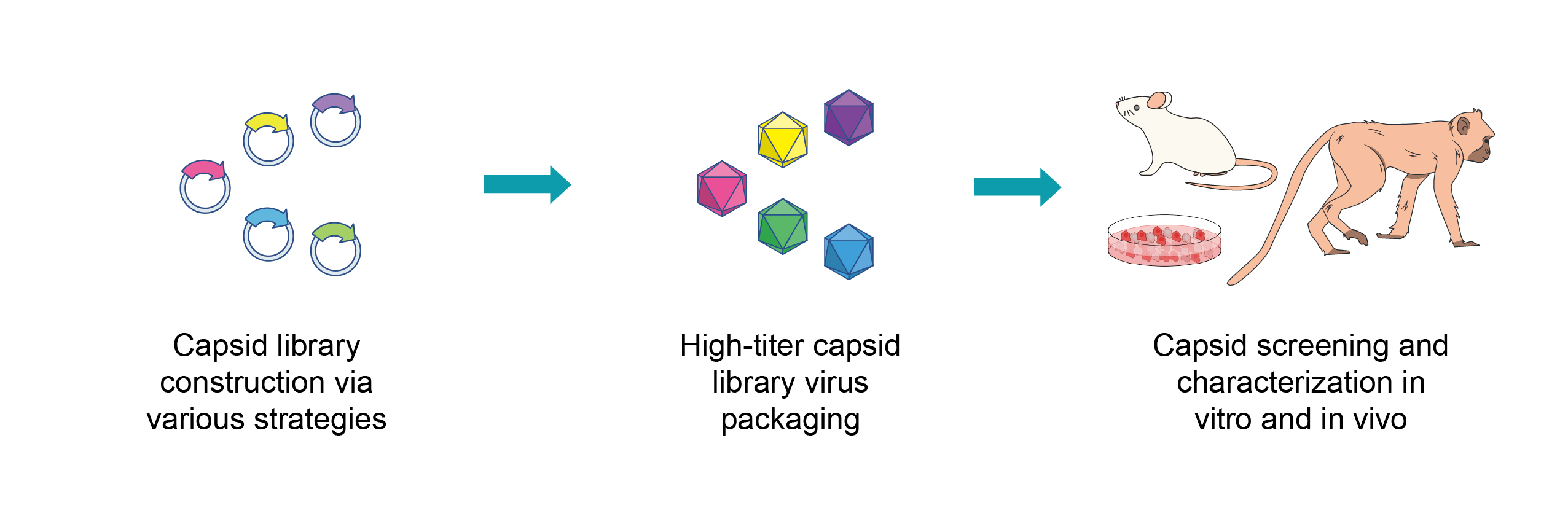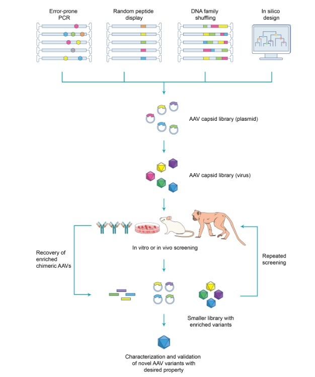 AAVキャプシド進化のワークフロー全体における最も重要なステップは、rep遺伝子とキャプシド遺伝子変異型からなるキメラAAVゲノムを運ぶプラスミドDNAからなる非常に多様なAAVキャプシドライブラリーの構築です。 キャプシド遺伝子変異型は、エラープローンPCR、ランダムペプチドディスプレイ、DNAファミリーシャッフリング、またはin silicoデザインなど、さまざまなアプローチを使用して効率的に構築できます。 次に、キャプシドライブラリーはウイルス粒子にパッケージングされ、各ウイルス粒子はキメラゲノムキャプシド変異体を保持します。次にウイルスライブラリーは、キメラAAVの特性をテストするスクリーニングを行います。