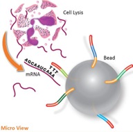 HIVETM sample collectorの各ピコウェルには、あらかじめ固有のバーコードとpoly(dT)からなるオリゴヌクレオチドが付加した磁気ビーズが入っています。ピコウェルに捕捉されたシングルセルはLysisされ、細胞由来のmRNAはビーズ上のpoly(dT)に捕捉されます。捕捉されたmRNAをテンプレートに逆転写を行い、mRNAの3’側に対するcDNAを作製します。完成したライブラリーを次世代シーケンサーでリードアウトします。(fig.3)