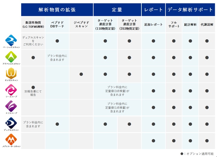 | メニュー | 解析目的 | 測定機器 | 測定対象 | 検出物質数 |
