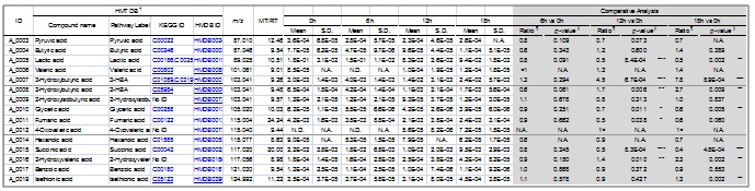 CE-TOFMS | 約1,000種のイオン性代謝物質 糖リン酸・アミノ酸・核酸・有機酸・ビタミン・短/中鎖脂肪酸・ジペプチドなど |