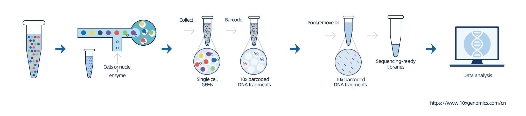 核の単離は、10X Genomics Chromium チップによって行われます。このシステム内では、バーコード、プライマー、酵素、および単一の核を組み込んだゲルビーズがナノリットルサイズの油滴に封入され、ゲルビーズインエマルジョン(GEM:Gel Beads-in-Emulsion)を形成します。GEM 形成後、核 GEM 内で細胞溶解とバーコードの放出が起こります。その後、mRNA 分子は逆転写を受け cDNA となり、10X バーコードとユニーク分子識別子(UMI:Unique Molecular Identifiers)が組み込まれます。これらの cDNA はその後、標準的なシークエンシングライブラリ構築に用いられ、シングルセルレベルでの遺伝子発現プロファイルの堅牢かつ包括的な探索を容易にします。(