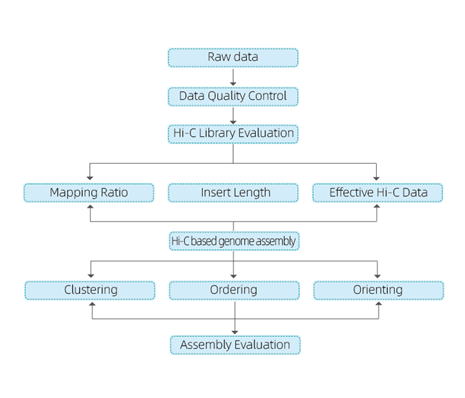 Hi-Cシークエンスは、近接性に基づく相互作用の探査とハイスループットシークエンスを組み合わせることで、染色体の配置を把握するためにデザインされた手法です。相互作用の強度は、染色体上の物理的距離と負の相関があると考えられています。従って、Hi-Cデータは、ドラフトゲノム内のアセンブルされたコンティグのクラスタリング、順序付け、方向付けをガイドし、それらを特定の染色体に割り当てるために使用されます。この技術は、集団ベースの遺伝マップがない場合でも、染色体レベルのゲノムアセンブリを可能にします。Hi-Cはあらゆるゲノムに有効です。(