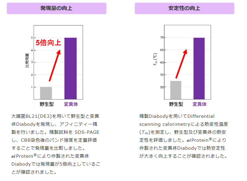 ® を利用し、抗原結合性への影響を最小限に、抗体の発現量・安定性などの複数の特性値をバランスよく同時に向上させるサービスです。aiProtein