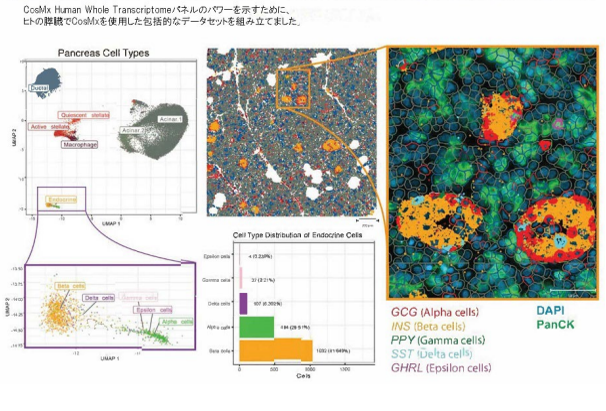 fig.1)を用いた空間遺伝子発現解析サービスです。業界唯一のシングルセル・サブセルラーレベルの超高解像度でホールトランスクリプトームの空間解析を実現し、網羅的遺伝子発現プロファイル(ヒト最大19,000遺伝子、マウス最大21,000遺伝子対応)とクラスタリング・セルタイピング解析により、複雑な生命現象の解明と新たな発見を支援します。