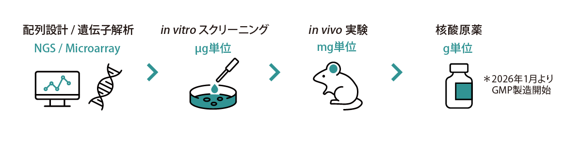 2026年1月からは、三菱ガス化学株式会社(MGC)との共同事業によりGMP対応の核酸合成にも対応。