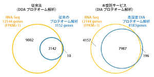 | 標準 DIA プロテオーム解析によるタンパク質発現・相対定量解析 内容:発現タンパク質の同定ならびに相対定量解析 方法:LC-MS/MS(DIA) 参考検出数:4,000~6,000 タンパク質 必要サンプル量:タンパク質 40μg 以上、 細胞 5 x105 個 以上、組織 10mg 以上、血清 / 血漿 1μL 以上、 尿 200μL 以上 |