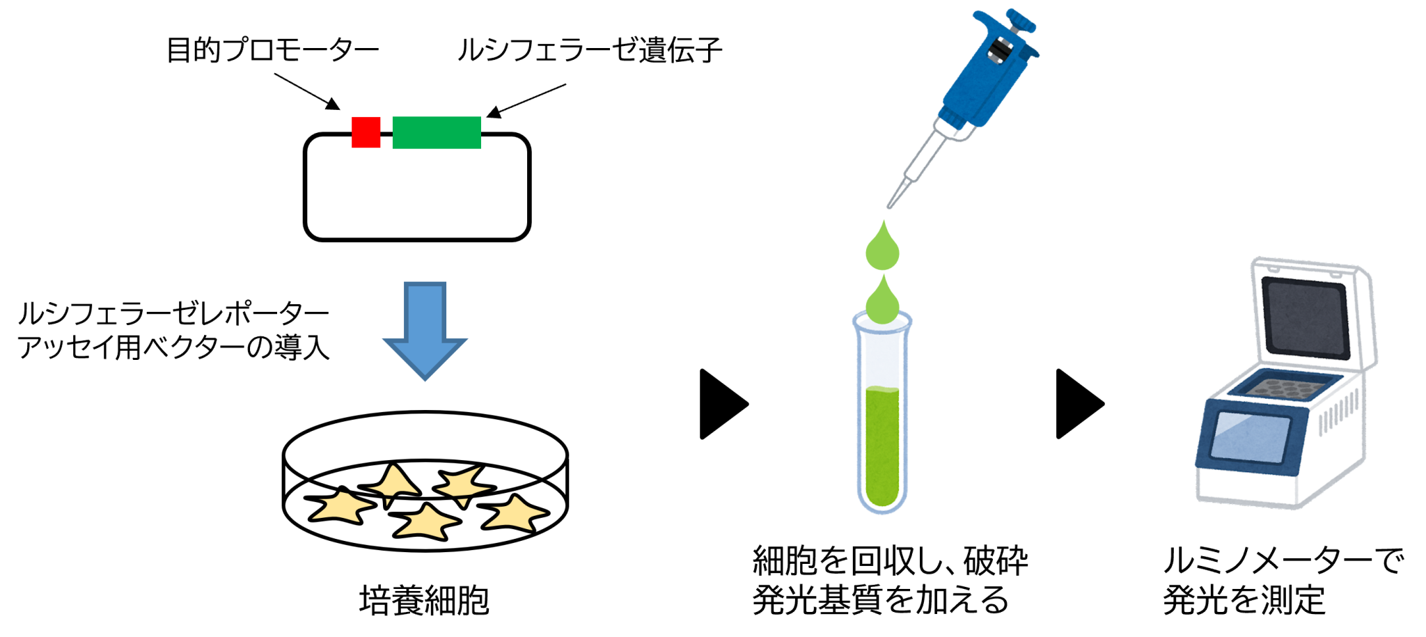目的プロモーター制御下でルシフェラーゼ遺伝子を発現するベクターを細胞に導入し、一定期間培養後、細胞を回収し、破砕します。その後、発光基質を加え、ルミノメーターで蛍光を検出します。