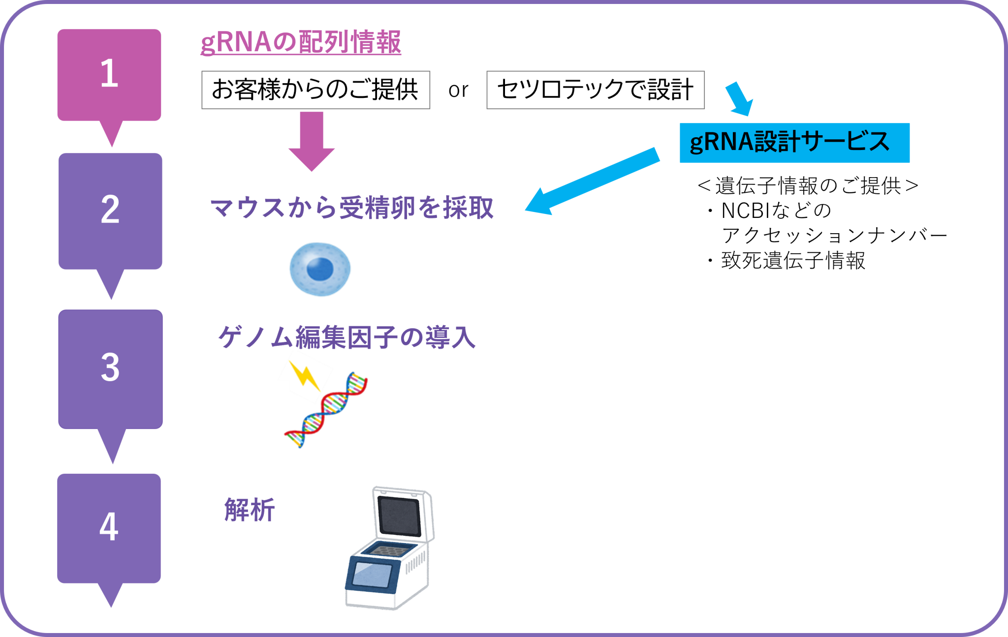 ゲノム編集前に設計したgRNAの切断活性を確認し、マウス受精卵で編集を実施後、PCRとシークエンス解析で効率を評価します。
