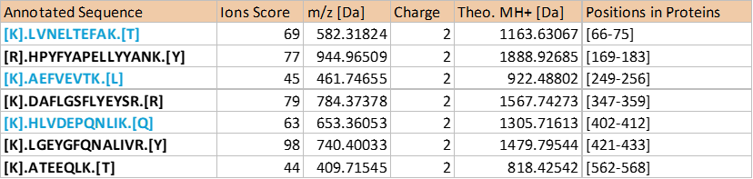 1.通常のタンパク質は分子量が大きく、そのままでは良好なMS/MSスペクトルが得られないため、トリプシンなどの酵素処理によってペプチド断片にします。