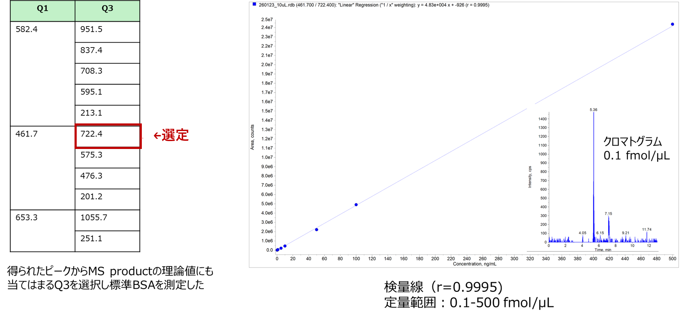 4.候補ペプチドの選定を行い、LC-MS/MSを用いてメソッドの構築および定量を行います。