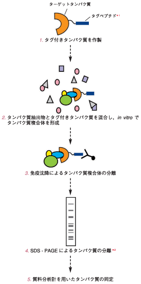 タグペプチドを結合させたターゲットのタンパク 質と相互作用によって結合したタンパク質を免疫沈降により分離し、得られたタンパク質を質量分析を用いて同定します。