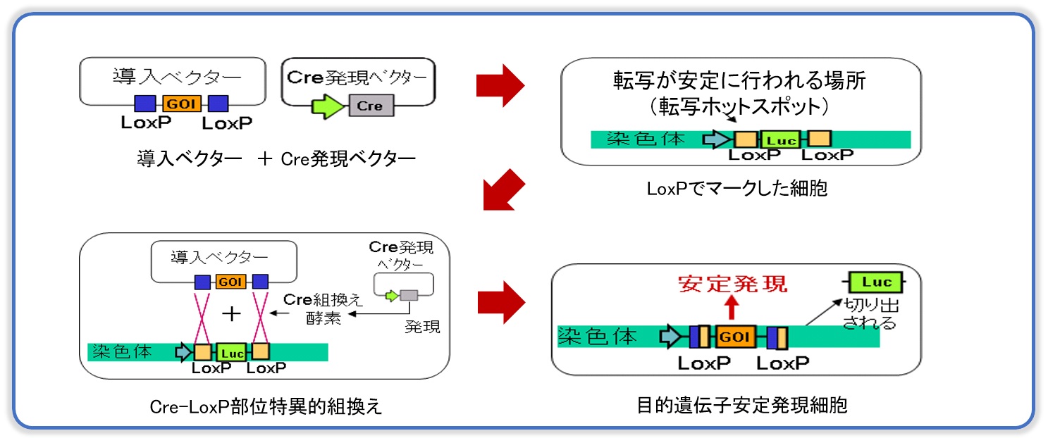 細胞のゲノム上に存在する転写が安定的に起こる領域(転写ホットスポット)へ、目的遺伝子を簡便かつ確実に導入する技術により、短期間で目的遺伝子を安定に高発現する細胞株を取得します。
