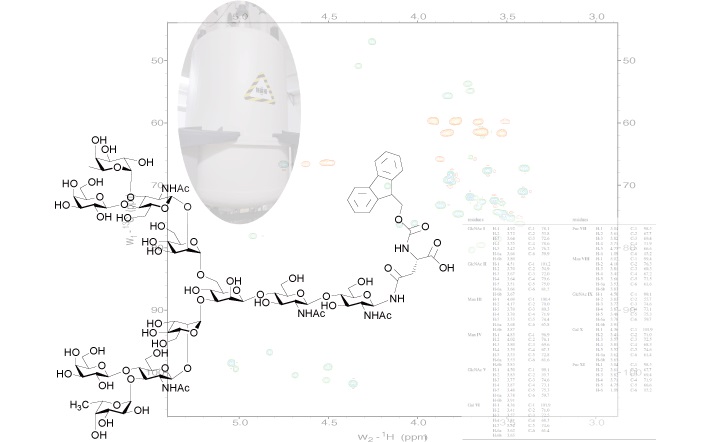 Cと各種2次元NMR(DQF-COSY、TOCSY、HSQC、NOESY、HMBCなど)を駆使し、糖結合位置、様式を含めた糖鎖詳細構造データをご提供致します。