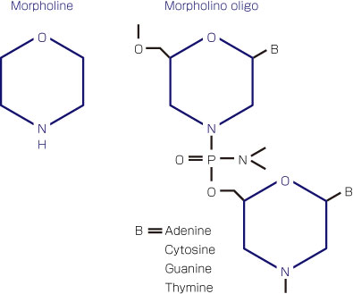 このモルフォリノオリゴをアンチセンスに用いたものが、モルフォリノアンチセンスオリゴ(Morpholino Antisense Oligo)となります。
