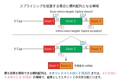 pre-mRNAのエキソンとイントロンの境界領域を標的配列として、スプライシングを阻害しmRNAの成熟を不完全にします。ノーザンブロッティングやRT-PCRといったRNAレベルでの解析により阻害効果を確認できます。特定のスプライシングバリアントに対する発現阻害も可能です。(fig.5)