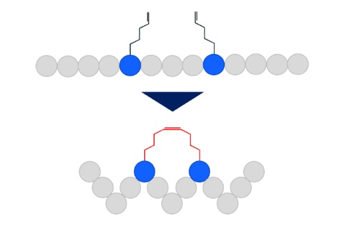 スクラム社では、分子内SS結合やHead to tail(N末端ーC末端)の環状ペプチド(fig.1)(fig.2)のみならず、チオエーテルやステープルによる環状ペプチドにも対応いたします。(fig.3)(fig.4)