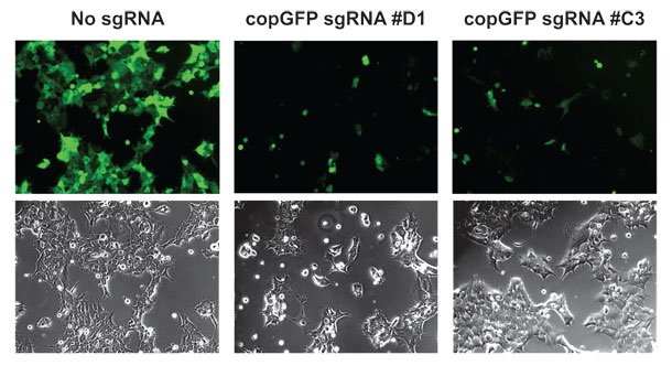 copGFPを標的とする数種のsgRNAをデザインし、copGFP安定発現HEK293細胞に形質導入した。9日後にGFP蛍光発現を観察したところ、少なくとも70%の細胞でGFP発現が消失していた。(