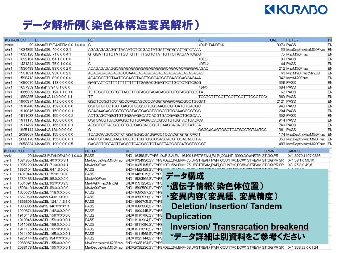 ヒトの場合は変異解析以外にも、染色体の構造変異、コピー数変異の解析が可能です。(