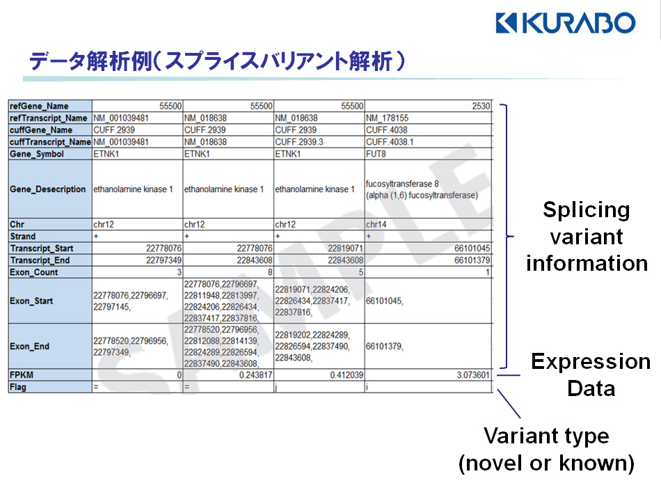 バリアントを検出した遺伝子の情報(遺伝子名、データベースID、染色体位置)、バリアントに関する情報(エクソン数、エクソン開始・終止場所)、発現値(FPKM値)をエクセルファイルにて報告します。(