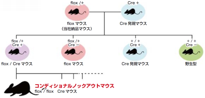 生存に必須な遺伝子の機能を解析するのに非常に有用なコンディショナルノックアウト(条件付き遺伝子破壊)のマウスを作製します。