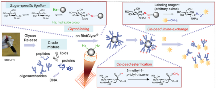 化学選択的な糖鎖捕捉反応に基づいて、生体試料由来糖鎖の網羅的かつ定量的なプロファイル取得を大幅に高速化する技術です。生体分子中で糖鎖にのみ存在するアルデヒド基を、ヒドラジド基を有するビーズで糖鎖だけを選択的に捕捉し、ビーズ上でメチル化、ラベル交換反応を行うことで、迅速な糖鎖解析を可能とします。この方法によってペプチド、脂質、タンパク質、DNA など大量の夾雑物が存在する生体試料から糖鎖のみを抽出、定量解析することが可能です。