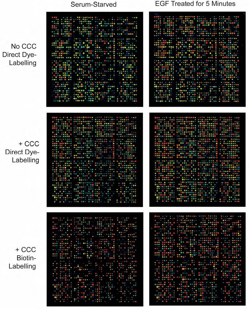 Overnight, serum-starved A431 cells were treated with and without 100 nM EGF for 5 minutes prior to preparation of cell lysates. The lysates were dyelabeled either without or with prior chemical cleavage at cysteine (CCC). Note that in this study, the dye-labelling step was done first, and the chemical cleavage was subsequently performed afterward.