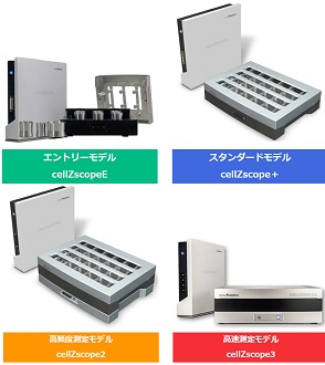 | 製品内容 | cellZscopeE CELL MODULE cellZscopeE CONTROLLER | cellZscope+ CELL MODULE cellZscope+ CONTROLLER | cellZscope2 CELL MODULE cellZscope2 CONTROLLER cellZscope2 STATION | cellZscope3 CELL MODULE cellZscope3 STATION cellZscope3 CONTROLLER Software:cellZscope control / analysis software on USB 電極(4セット) | cellZscope3 CELL MODULE cellZscope3 STATION cellZscope3 CONTROLLER Software:cellZscope control / analysis software on USB 電極(16セット) |