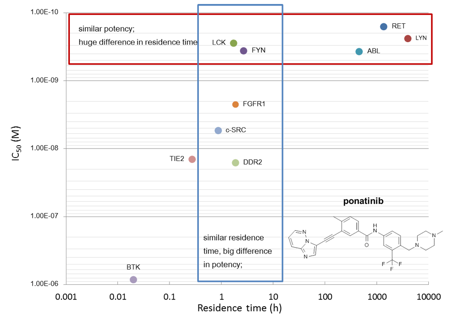 市販されている薬剤の中には、標的分子との結合時間が長いために、血漿中からの消失半減期よりも長く標的分子に作用し、酵素アッセイで得られたIC