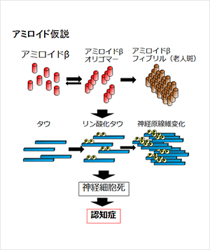 1.Aβが自己凝集によって可溶性凝集体(Aβオリゴマー)や不溶性凝集体(Aβフィブリル)を形成する。 2.Aβ凝集体がタウタンパク質の過剰なリン酸化と自己凝集を誘導し、異常な凝集タウであるNFTを形成する。 3.NFTが神経細胞死を誘導する。 4.脳萎縮が進行、認知障害が生じ、アルツハイマー病を呈する。 |