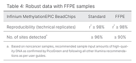 ホルマリン固定パラフィン包埋(FFPE)組織サンプルは、Infinium メチル化 HD アッセイの改良バージョンを使用すると堅牢なパフォーマンスを示します(fig.6:表4)。